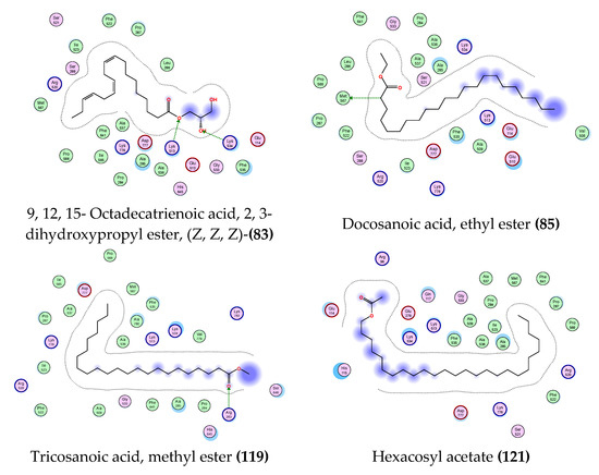 | Tricosanoic acid, methyl ester (119) | −9.3228426 | O36 | NH2 ARG 283 (A) | H-acceptor | 3.01 | −1.5 |