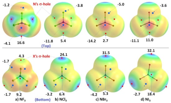 We now discuss a set of other examples in which covalently bound nitrogen acts as an electrophile, as observed in crystalline systems reported over many years. In these systems, covalently bound nitrogen, as in NX3 (X = F, Cl, Br, I), has a positive region on the R–N bond extension that is capable of attracting a negative site on an identical, or in a different molecule. This can be appreciated by looking at the MESPs shown in Figure 2, obtained using ωB97XD/Jorge-ATZP. The top view of Figure 2 shows nitrogen having a positive electrostatic potential along the X–N bond extensions, regardless of the nature of the halogen derivative attached to it. It is largest (16.6 kcal·mol−1) along the F–N bond extensions in NF3. As one passes from NF3 through NCl3 to NBr3, there is a decrease in VS,max from 16.6 kcal·mol−1 to 5.4 kcal·mol−1 to 2.7 kcal·mol−1, and the stability of the σ-hole on N in NX3 occurs in the order X = F > Cl > Br. By contrast, the lone-pair dominated region on N is negative, and the negativity increases in the order NF3 (−4.1 kcal·mol−1) > NCl3 (−11.8 kcal·mol−1) > NBr3 (−14.2 kcal·mol−1). These results demonstrate the amphoteric character of N in NX3.