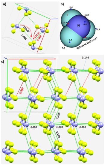 The unit-cell of the α-phase comprises four units of NF3, as shown in Figure 3a. It shows the intermolecular bonding modes between the building blocks responsible for the unit-cell of the NF3 crystal; these are consistent with the attraction between the positive and negative sites of electrostatic potential localized on different atomic domains (Figure 3b). In particular, Type-IIa N–F···F and F–N···F non-covalent interactions are observed and are inferred from the intermolecular distances and angles of interaction. The former is less directional but shorter than the latter (Figure 3a).