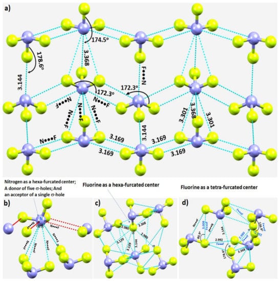 Our investigation shows that fluorine has the ability to act both as a hexa- and tetra-furcated center, as shown in Figure 4c,d, respectively. It is evident from Figure 4c that fluorine is an acceptor of three σ-hole bonds, thus forming one F–N···F and two N–F···F halogen bonds; it is a donor of a single σ-hole bond, forming an N–F···N halogen bond; and it shows capacity to form two or more N–F···F–N halogen-bonded Type-Ia and/or Type-Ib interactions—all within a distance of 2.90–3.20 Å. The Type-Ia N–F···F–N halogen-bonded contacts, such as those marked in Figure 4d, are commonly observed in fully fluorinated compounds, for example, the crystal of C6F6 [], and in similar compounds [,,]. Clearly, the complex topology of bonding between the NF3 molecules in the crystal structure requires a variety of theoretical studies to detail the nature and the strength of the interactions involved.