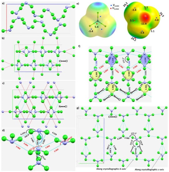 The crystal structure of NCl3 was reported in 1975 []. It crystalizes in the orthorhombic space group Pnma. There are 12 molecules in the unit-cell, as shown in Figure 5a. The mean N–Cl bond distance is 1.75(1) Å and the mean bond angle is 107(2)°. The insights gained from the values of VS,max and VS,min on the surface of an isolated NCl3 molecule above (Figure 2b) can now be used to understand its chemical reactivity.