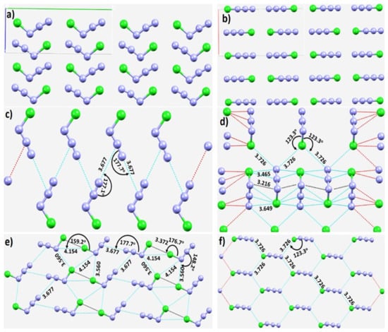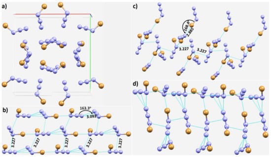 Halogen azides XN3 (X = F, Cl, Br, I), crystallographically known for some time [,,,,], have also been studied more recently [,]. ClN3 forms a chain-like polymer in the solid state, and BrN3, a helical structure, due to the formation of intermolecular Br···Nα and Nβ···Nγ interactions. The unit-cells of IN3 yield structures of polymeric (–I–N3–)n chains that are interlocked into layers, yet two modifications were reported for IN3. Its crystal structure, first determined by X-ray diffraction in 1993 [], corresponds to the α-phase of the crystal. The second modification of the crystal is called the β-phase [,]. Although most of the past studies, including the recent one published in 2021 [], have determined the lattice constants and important covalent bonding features, which have enhanced our knowledge of covalent p-block azide chemistry, the intermolecular bonding interactions between the XN3 molecules responsible for the crystals are yet to be explored computationally. The study of Schulz and coworkers [] demonstrates that ClN3 adopts a polymeric structure in the solid state with short intermolecular Cl···Cl distances, as was observed for the elemental halogen. The crystal structures of ClN3 [], and BrN3 [], are illustrated in Figure 6a,b and Figure 7a, respectively.