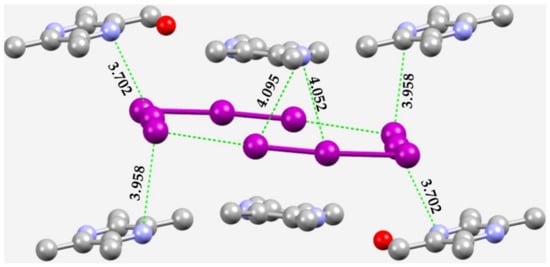 In crystalline tetramethylpyrazinium pentaiodide monohydrate [], Figure 11, the feasibility of N···I interactions is evident. They are charge-assisted pnictogen bonds, with bond distances in the range 3.7–4.1 Å, and are close to, or longer than, the sum of the vdW radii of N and I, 3.70 Å. They are π-centered since the π-hole on N accepts electron density from the iodine atom in . In addition, there are numerous H···I and (C)π···I type intermolecular interactions that are also responsible for the overall structure of the crystalline material.