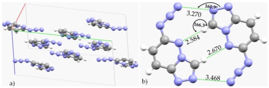 Olejniczak and coworkers [] recently reported crystalline materials formed as a consequence of CH···N and N···N interactions in the high-pressure structures of some pyridazines, viz. 6-azido-1,2,4-triazolo[4,3-b]pyridazine (C5H3N7) (as an anhydrate) and its 3-methyl derivative (C6H5N7) (as a hydrated clathrate). Short C–H···N and N···N intermolecular contacts could be observed in the structures; the latter involves attraction exclusively between the azide groups. Figure 14a shows the unit-cell of the crystal of C5H3N7, and Figure 14b shows the binary arrangement between the C5H3N7 molecular units in the crystal. As shown in the latter, there is a pair each of N···N and H···N close contacts between the two interacting units. The first is more directional than the second and follows a Type-IIa pattern of nitrogen bonding. In addition to these interactions, nitrogen-centered π···π stacking interactions appear to play a very important role in the stability of the crystal, as may be inferred from Figure 14a. The intermolecular distances of the N···N contacts are different, 3.369 and 3.165 Å. The latter is shorter, and the former is longer than twice the vdW radius of N, 3.32 Å, and both are directional.