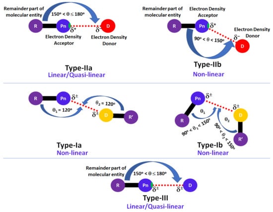 We employed the concepts of Type-I, Type-II and Type-III geometric topologies of bonding (Scheme 1) to characterize nitrogen-centered pnictogen bonds in the crystals illustrated in this overview [,].