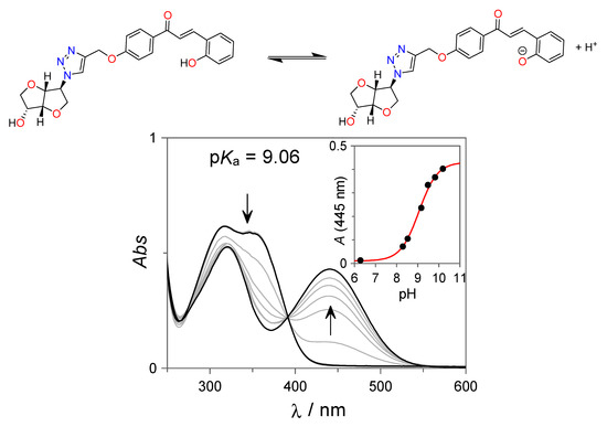 The acid–base and photoresponsive properties of the isosorbide-trans-chalcone conjugate 7 were investigated in H2O:DMSO solutions (85:15 v:v). The acid–base dissociation of the phenolic hydroxyl group of 7 in a basic medium was investigated by UV-Vis spectroscopy (see Figure 1). The neutral trans-chalcone 7 displays the typical absorption spectrum observed for this class of compounds with two overlapping bands centered at approximately 317 nm and 350 nm. As the pH increases, a new red-shifted absorption band, centered at 440 nm, starts to appear concomitantly with the disappearance of the former band. This new absorption spectrum can be assigned to the ionized form of 7. From the spectral variations shown in Figure 1, pKa = 9.06 for the formation of the ionized trans-chalcone 7 was obtained.