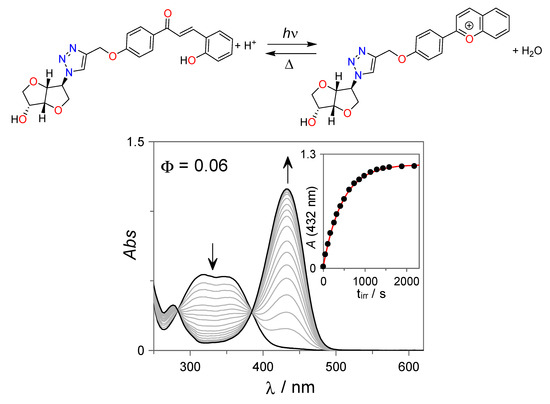 The photochemical properties of the trans-chalcone 7 were initially investigated at acidic conditions (pH = 2, [HCl] = 0.01 M). As can be observed from Figure 2, continuous irradiation of 7 with UV light (λirr = 365 nm) leads to the appearance of a new absorption band centered at 432 nm that can be assigned to the photoinduced formation of the corresponding flavylium cation with an apparent quantum yield of Φ = 0.06, in line with electronically similar flavylium photoswitches [28,33,34,49].