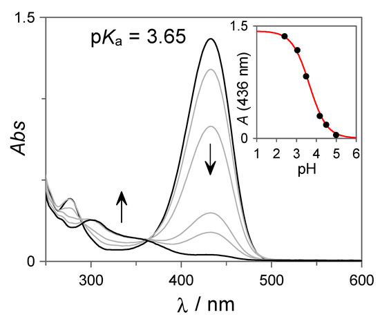 The photoinduced formation of the flavylium cation is pH-dependent, leading to quantitative but irreversible conversion at very acidic conditions and weak or no flavylium formation at higher pH values. To investigate the pH-dependent photochemical properties of 7 in more detail, irradiation experiments such as those shown in Figure 2 were conducted at different pH values. Figure 3 shows the final spectra obtained at the photostationary state as a function of the pH of the different solutions. As can be observed, at pH ~5, the flavylium cation is not formed upon irradiation, but as the pH decreases, its formation becomes more efficient. This behavior is in line with the pH-gated photochromism of flavylium compounds. In particular, for compounds displaying high cis-trans chalcone isomerization barriers, irradiation of the trans-species at higher pH values leads to the formation of an equilibrated mixture of cis-chalcone and hemiketal. At lower pH values, the hemiketal is thermally converted into the flavylium cation through the dehydration of this last species, driving the equilibria towards the formation of the colored cation. From the pH-dependent UV-Vis spectral variations shown in Figure 3, an apparent pKa = 3.65 can be obtained for the pH-dependent photoinduced formation of the flavylium cation.