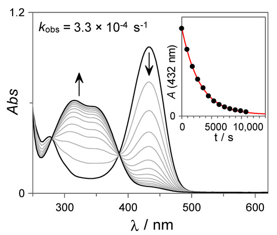 In order to investigate the reversibility of the photochromism observed for 7, the recovery of the trans-chalcone was monitored at T = 60 °C by UV-Vis spectroscopy. As can be observed from Figure 4, the absorption band assigned to the flavylium cation disappears according to first-order kinetics (kobs = 3.3 × 10−4 s−1) leading to the concomitant formation of the trans-chalcone, demonstrating the reversibility of the system at this pH value.