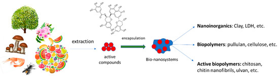 However, biomolecules are vulnerable to oxygen, light, heat, and pH. Therefore, encapsulation of these molecules can be helpful for better modulation of their properties and easier integration of functional molecules into the final product [21]. In particular, combination with nanostructured materials can lead to the preparation of stable bio-nanosystems [22] that can improve the solubility and bioavailability of these substances, protect them from environmental conditions, and enable their controlled release and targeted delivery. Biopolymers or nanoinorganics are often considered to encapsulate active molecules. An example of nanoinorganics is layered double hydroxides (LDH), which were used to encapsulate salicylic acid and rosmarinic acid [23]. Biopolymers obtained by biotechnology that are useful as carriers of functional compounds are pullulan [24] or bacterial cellulose [25]. Renewable biopolymers can be used, for instance, as active encapsulants, as in the case of chitin nanofibril–nanolignin complexes [26], which are both antimicrobial and antioxidant. These complexes were used to encapsulate vitamin E or C, lutein, glycyrrhetinic acid, and nicotinamide. Ulvan [27] can be considered another encapsulant for active biomolecules. Researchers are particularly engaged in studying the synergistic actions of such bio-nanosystems [26,28,29] and investigating techniques to apply them on polymeric substrates [29].