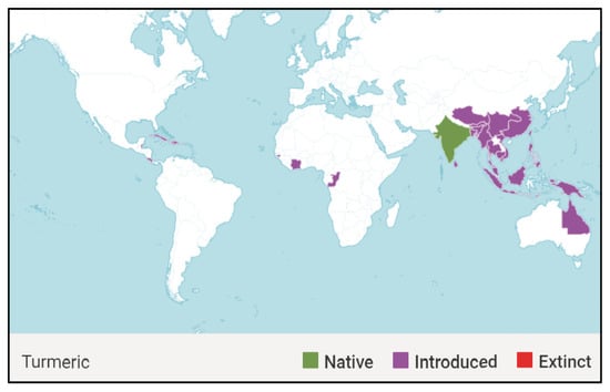 Curcuma longa is native to India and was introduced to other areas such as the Andaman Islands, Assam, Bangladesh, Belize, Borneo, Cambodia, Caroline Islands, China South-Central, China Southeast, Comoros, Congo, Cook Islands, Costa Rica, Cuba, Dominican Republic, East Himalaya, Easter Islands, Fiji, Gilbert Islands, Guinea-Bissau, Gulf of Guinea Islands, Haiti, Hawaii, Ivory Coast, Jawa, Leeward Islands and Lesser Sunda Islands, M [14]. Figure 1 represents the global distribution of Curcuma longa.
