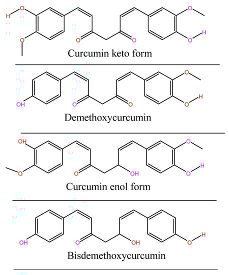 Curcumin has a seven-carbon linker and three major functional groups: an aromatic O-methoxy-phenolic group, an aromatic O-methoxy-phenolic group and an aromatic O-methoxy-phenolic group [19]. Two-unsaturated carbonyl groups join the aromatic ring systems, which are phenols. It is a diketone tautomer in both enolic and keto forms in organic solvents and water [20]. The diketones deprotonate to create enolates and form stable enols; the-unsaturated carbonyl group is a good Michael acceptor and undergoes nucleophilic addition [21]. Curcumin is poorly soluble in water due to its hydrophobic nature [20]. Organic solvents, on the other hand, make it very soluble. Selected structures of the bioactive present in Curcumin are presented in Figure 3.