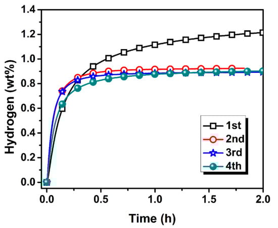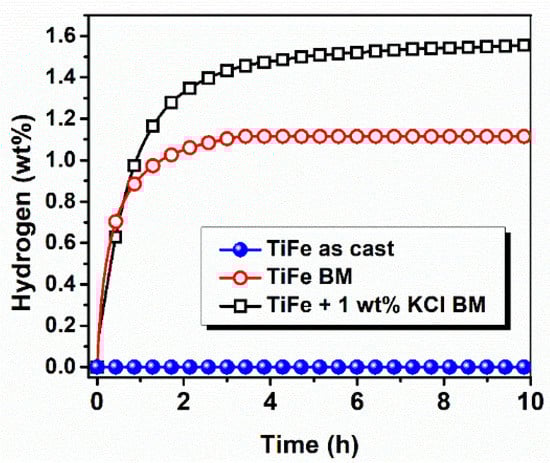 - Abe, M.; Kuji, T. Hydrogen Absorption of TiFe Alloy Synthesized by Ball Milling and Post-Annealing. J. Alloys Compd. 2007, 446–447, 200–203. [Google Scholar] [CrossRef]