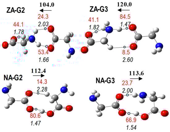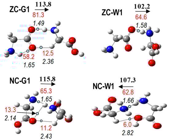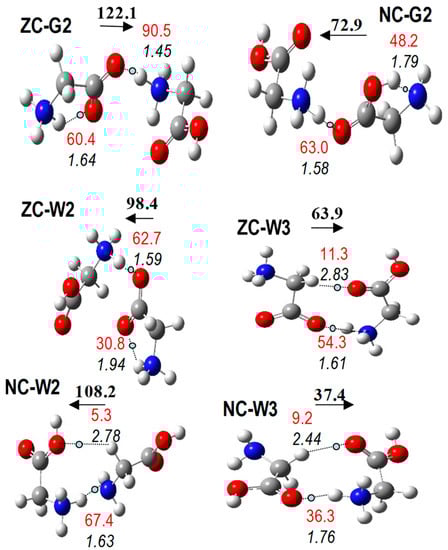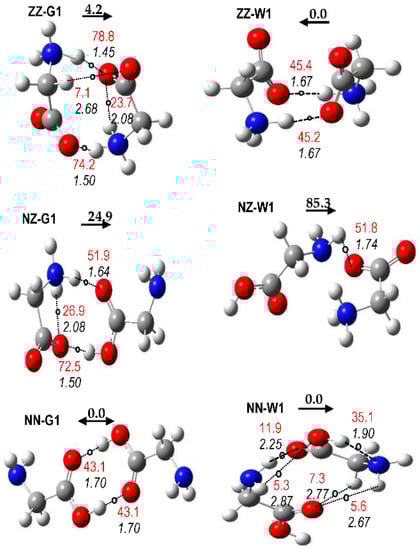 Previous studies on protonated glycine dimers indicate the preference for NC forms in the gas phase [12,13,14,15,16]. Although Price et al. [12] reported that the most stable structure contains a N–H···N IHB, a consensus seems to be reached in the remaining studies [13,14,15,16] supporting the presence of N–H···O IHB in the most stable dimer. Finally, Armentrout et al., employing MP2(full)/6-311+G(2d,2p)//B3LYP/6-311+G(d,p), reported that a low-energy NC geometry (not fully converged in the frequency calculation) displays one N+–H···N IHB, although the most stable geometry displays N+–H···O IHB [16]. All the geometries considered in previous studies were included in our conformational sample for NC and ZC dimers. Our results, both B3LYP and MP2, agree with previous ones, indicating that NC structures are more stable than ZC in the gas phase. Moreover, the most stable of NC dimers displays N+–H···N IHB (Figure 7).