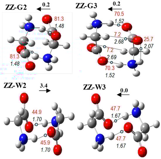 Aqueous solution computational studies for glycine dimers are scarcer. Friant-Michel and Ruiz-López [22] discussed three stacked ZZ structures, one linear NZ structure, and two cyclic NN ones. Hamad and Catlow [20] simulated three cyclic, doubly hydrogen-bonded ZZ structures in an aqueous solution using ab initio molecular dynamics. In the present work, the whole set of structures considered in the gas phase was optimized with PCM, both at B3LYP and MP2 levels. The following trends can be highlighted: