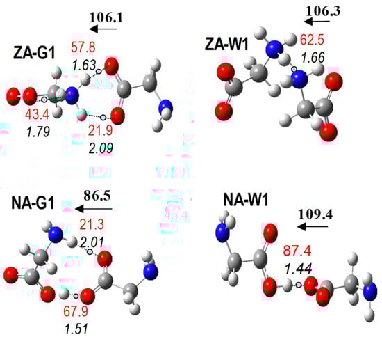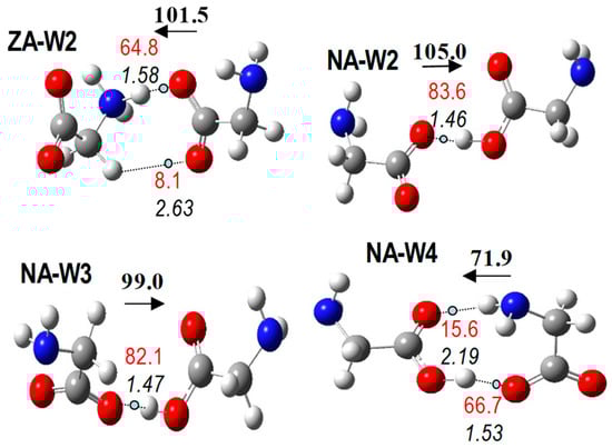 The NA series of dimers (less stable than ZA in the aqueous solution) contains four conformers with very close energy (Figure 6). Specifically, NA-W1, NA-W2, and NA-W3, only differ in the dihedral angle containing the O–H···O IHB.