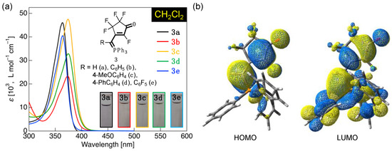 | 3b | CH2Cl2 | 373 (23,300) | HOMO (–6.87) → LUMO (–1.09) | 5.78 (133) |