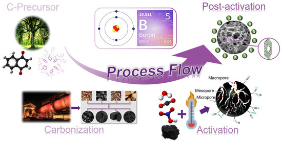 | 17 | Activated Carbon | Solid-Phase Substitution | H3BO3; before Carbonization | 4.3 | [203] |