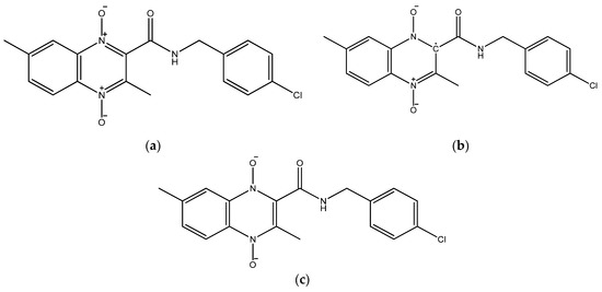 The molecular structures for the 1,4-di-N-oxide quinoxaline-2-carboxamide derivatives were drawn using GaussView 5 [34]. For each derivative, three structures were drawn including the original neutral molecule, the anion product from the first N-oxide reduction (Wave 1), and the dianion product from the second N-oxide reduction (Wave 2). Figure 1 shows 2D structures created with ChemDraw for the three individual structures for Compound 20 (Table 1). The original neutral molecule is shown in Figure 1a. The anion product structures for the product of wave 1 had the radical attached to the carbon adjacent to the amide group (Figure 1b). The dianion product from wave 2 is shown in Figure 1c.