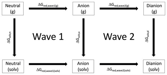The change in Gibbs Free Energy from the reduction of the derivative is found by comparing the energy of the structures in gas phase before and after the reduction of the derivative. For wave 1, the change in Gibbs Free Energy ( is the difference between the energy of the anion ( and neutral forms ( of the derivative (Equation (2)).
