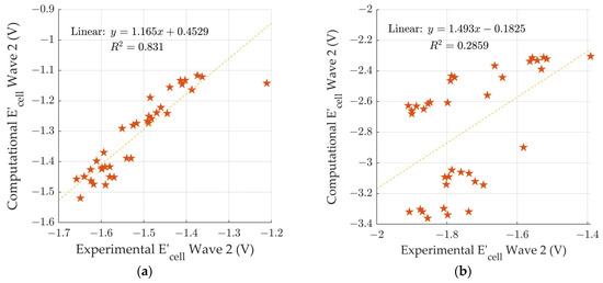 Comparison of computational electrochemical cell potentials vs. experimental electrochemical cell potentials [18] for (a) wave 1, and (b) wave 2.