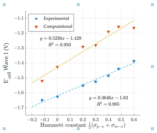 Comparison of the Hammett constant [41] vs computationally predicted and experimental [18] electrochemical wave 1 cell potentials.