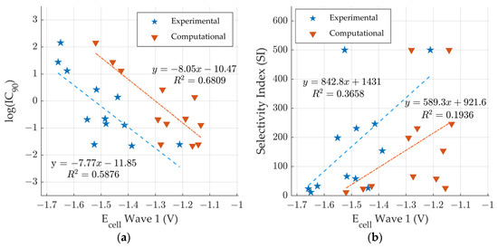 Comparison of computationally predicted and experimental electrochemical cell potentials [18] vs. anti-tuberculosis activity for compounds 1–12 [18]. (a) logIC90 vs wave 1 and (b) SI vs wave 1.