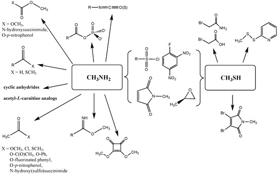 This report therefore has focused on generating these thermodynamic properties by density functional theory (DFT) for a range of commonly used bioconjugation reactions for lysine (modeled as methylamine) and cysteine (modeled as methanethiol) residues (Figure 1), comparing these to several representative “click” reactions [27,28,29], and addressing the energetics of several previous observations that certain cellular intermediates (thioesters, acyl phosphates, and acetyl-L-carnitine) are capable of non-enzymatically modifying proteins in vivo [30,31,32,33,34,35]. A concluding section addresses the ability of computation to provide predictions as to the potential for protein modification by new chemical entities, with a cautionary note on protein modification side reactions when employing synthetic substrates to measure enzyme kinetic activities.