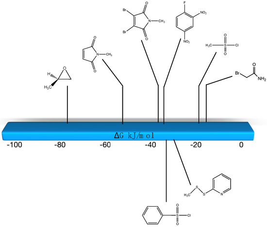 Reagents that target cysteine residues are important, and, due to the low abundance of exposed cysteine surface residues in the majority of proteins [87], site-directed mutagenesis has been a very successful strategy to introduce a surface-exposed cysteine for labeling or for crosslinking studies [13,130,149,150,151]. The reaction of thiols with epoxides is important in the thiol-epoxy “Click” reaction, allowing for the rapid formation of covalent bonds under mild conditions and having importance in the preparation of hydrogels used in tissue engineering, for example [152,153]. The reaction of sulfonyl chlorides 25 and 26, 2-methyloxirane (27), N-methylmaleimide (28), and DNFB (29) with methanethiol as a model for the cysteine side chain is presented in Table S8 (T1 and G3(MP2)) and Table 9 (M06-2X/6-311+G(2df,2p)//B3LYP/6-31G(d) in vacuum and intrinsic aqueous phase). The reactions of 2-methyloxirane (27) and N-methylmaleimide (28) are the most thermodynamically favorable (ΔG values of −77.84 kJ/mol and −55.92 kJ/mol, respectively) (Table 9) for the overall reaction with methanethiol in an aqueous phase and comparable to those reagents with the lysine side chain model, methylamine. On the other hand, the methylamine reactions involving the sulfonyl chlorides and DNFB are more thermodynamically favorable compared to the thiol reaction with these molecules (Table 7 and Table S6).