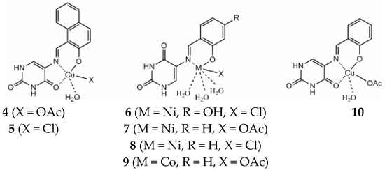 - Koz, G.; Kaya, H.; Astley, D.; Yaşa, İ.; Astley, S.T. Synthesis, Characterization and Antimicrobial Screening of Ni(II), Cu(II) and Co(II) Complexes of Some Schiff Base Ligands Derived from 5-Aminouracil. Gazi Univ. J. Sci. 2011, 24, 407–413. [Google Scholar]