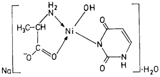 - Gupta, M.; Srivastava, M.N. Synthesis and characterization of complexes of copper(II), nickel(II), cobalt(II) and zinc(II) with alanine and uracil or 2-thiouracil. Synth. React. Inorg. Met.-Org. Chem. 1996, 26, 305–320. [Google Scholar] [CrossRef]