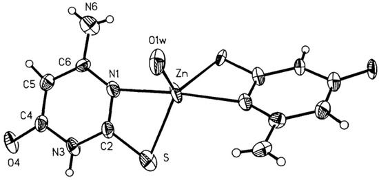 - Romero, M.A.; Sanchez, M.P.; Quiros, M.; Sanchez, F.; Salas, J.M.; Moreno, M.; Faure, R. Transition metal complexes of 6-amino 2-thiouracil; crystal structure of bis(6-amino-2-thiouracilato)aquazinc(II) dihydrate. Can. J. Chem. 1993, 71, 29–33. [Google Scholar] [CrossRef]