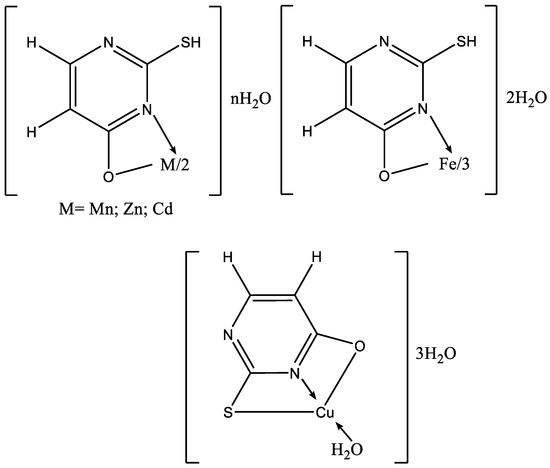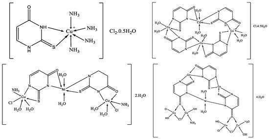 - Masoud, M.S.; Soayed, A.A.; El-Husseiny, A.F. Coordination modes, spectral, thermal and biological evaluation of hetero-metal copper containing 2-thiouracil complexes. Spectrochim. Acta Part A Mol. Biomol. Spectrosc. 2012, 99, 365–372. [Google Scholar] [CrossRef]