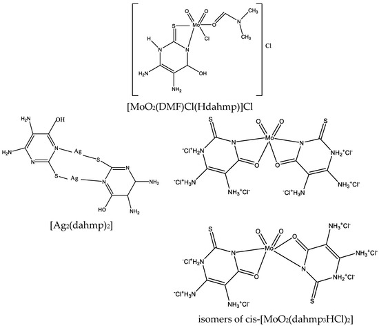 - El-Morsy, F.A.; Jean-Claude, B.J.; Butler, I.S.; El-Sayed, S.A.; Mostafa, S.I. Synthesis, characterization and anticancer activity of new zinc(II), molybdate(II), palladium(II), silver(I), rhodium(III), ruthenium(II) and platinum(II) complexes of 5,6-diamino-4-hydroxy2-mercaptopyrimidine. Inorg. Chim. Acta 2014, 423, 144–155. [Google Scholar] [CrossRef]