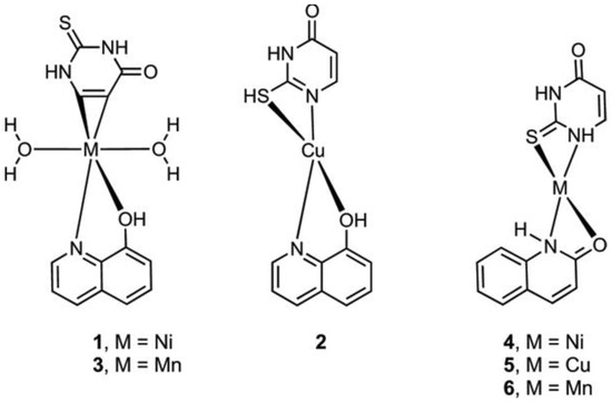 - Gupta, M.; Srivastava, M.N. Synthesis and characterization of mixed ligand complexes of copper(II), nickel(II), cobalt(II and zinc(II) with glycine and uracil or 2-thiouracil. Polyhedron 1985, 4, 475–479. [Google Scholar] [CrossRef]