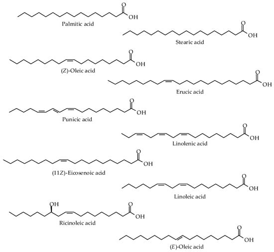Fats and oils can be found in different quantities in a variety of foods. FAs are the primary constituents of lipids, which make up about 90% of the fats found in food. FAs are classified based on the presence or absence of double bonds. FAs with single bonds between each carbon atom are considered saturated FAs. They are mainly present in animal fats and dairy products. FAs with one double bond between carbon atoms are considered as monounsaturated and two or more double bonds between carbon atoms are called polyunsaturated [4]. Furthermore, the terms cis or (Z) and trans or (E) describe the positioning of carbon atom chains in relation to a double bond. When the chains are on the same side of the double bond, a bent shape called the (Z) arrangement is created. In contrast, the chains are on opposite sides of the double bond in the (E) arrangement, resulting in a straight shape. The first arrangement occurs without any human intervention, whereas the second arrangement is produced through the implementation of technology during the process of extraction and purification [5]. Since most of the (E)-fats that we consume in our diet come from industrial sources, particularly in the form of vanaspati, shortening, and margarine, which are used in baked and fried food like cakes, cookies, bread, potato chips, and other fried products. The intake of (E)-FAs has been linked to elevated levels of low-density lipoprotein cholesterol, which is associated with a higher risk of cardiovascular and cerebrovascular diseases [6,7]. The major FAs discussed in this work are shown in Figure 1.