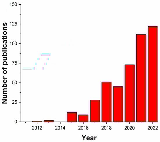 Number of publications on 3DP techniques using polymers for the production of DDSs (from 2012 to 2022). The search considered works containing the terms “3D printing”, “polymer”, and “drug delivery”. Source: scopus.com., (accessed on 11 January 2024)