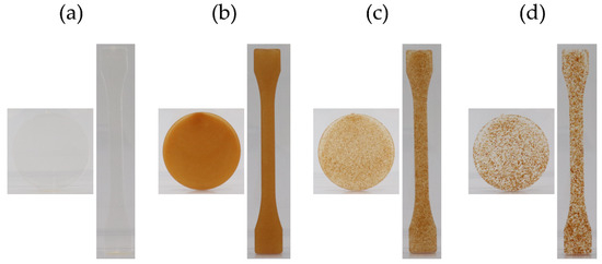 To maximize the potential effect of particle size on specimen properties, specimens were prepared using 0–53 μm, 125–250 μm, and 315–500 μm PPeel particles, representing the finest, medium, and coarse particle classes, respectively, obtained by sieving dried and ground PPeel (see Section 2.2.2). Using constant PPeel mass in the PLA–PPeel biocomposites (10% w/w), the number of incorporated PPeel particles decreased with increasing particle size class, causing optical differences between the specimens (Figure 2). Specimens containing fine PPeel particles (0–53 μm, Figure 2b) appeared as a continuous/homogeneous brownish material. Specimens containing bigger/coarser PPeel particles (125–250 μm Figure 2c, 315–500 μm Figure 2d) were characterized by a transparent PLA matrix sprinkled with brown particles. As a reference, neat PLA (Figure 2a) resulted in completely transparent specimens.
