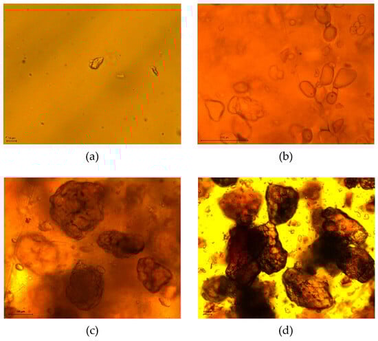 Microscopic images of samples containing PPeel filler (Figure 3b–d) showed the porosity and slightly elongated, irregular non-spherical shape of the PPeel particles. In comparison, potato starch particles are characterized by a spherical to elongated shape, but a smoother surface [22]. A tendency of particles to form agglomerates and an occurrence of deformed particles was also seen in the microscopic images.