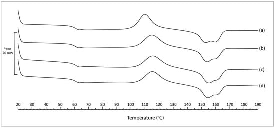 Averaged DSC curves of the 2nd heating cycle of neat PLA specimen and PLA–PPeel biocomposite specimen containing different potato peel particle sizes: (a) neat PLA, (b) PLA–PPeel biocomposite (0–53 μm), (c) PLA–PPeel biocomposite (125–250 μm), and (d) PLA–PPeel biocomposite (315–500 μm).