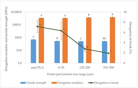 Tensile properties of neat PLA and PLA–PPeel biocomposites prepared via injection-molding using different PPeel particle size classes. Significant differences (p ≤ 0.05) between mean values are represented by the use of different letters: A, B, C.