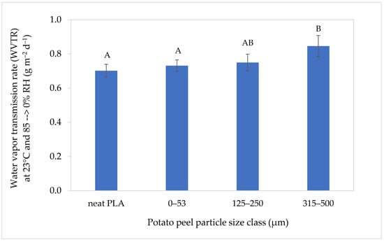 To our knowledge, PPeel particles have yet not been incorporated into a PLA matrix, and the influence of PPeel particle size on composite properties has not been investigated before, either. Therefore, the aim of this study was to determine the effect of PPeel particle size on the PPeel–PLA composite’s physical properties. We hypothesize that tensile strength and ductility will decrease, and tensile modulus and water vapor transmission rate will increase with increasing particle size of PPeel due to increased “breaks” within the continuous PLA polymer matrix.