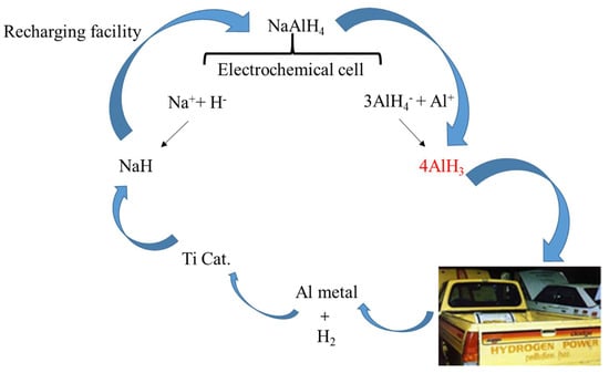 Zidanet et al. [45] used the Al as the anode and Pt as cathode, respectively, and the whole electrochemical process was realized in the NaAlH4-THF electrolyte. As shown in the reaction paths (Reactions (5) and (6), AlH3 can be produced via two distinct reaction mechanisms at the Al electrode, involving the oxidation of ions and the reaction of AlH4- with the Al anode. Based on this, a cycle using electrolysis and catalytic hydrogenation to treat waste aluminum was proposed [46] (see in Figure 2), in which the problem of the high hydrogen pressure and the formation of stable by-products such as LiCl could be avoided. It is noteworthy that the addition of LiCl is notable for its ability to enhance the yield of AlH3; meanwhile, alkali hydride (e.g., LiH, NaH and KH) could be reformed through electrochemical potential.