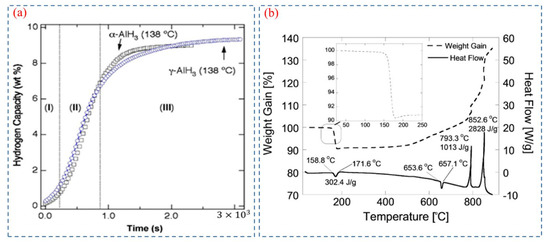 (a) Isothermal decomposition curves of α-AlH3 and γ-AlH3 [51]. Copyright 2007, Elsevier. (b) TGA and DSC of neat AlH3 in an argon atmosphere [1]. Copyright 2019, Wiley Online Library.