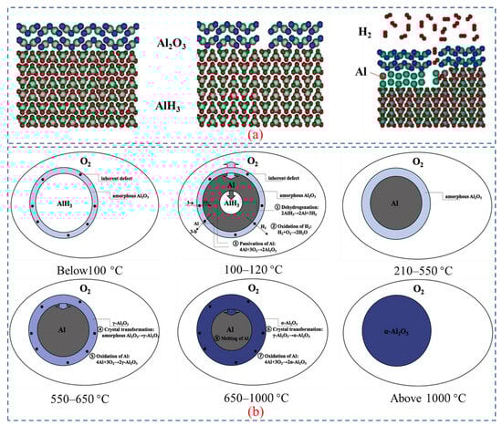 (a) The mechanism underlying hydrogen release from AlH3 [62]. Copyright 2010, AIP Publishing. (b) The mechanism of dehydrogenation and oxidation of AlH3 at different temperatures [10]. Copyright 2020, Elsevier.