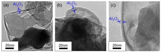 Dehydrogenation and oxidation of AlH3 are influenced by three factors: the oxide layer, the surrounding atmosphere, and temperature. As mentioned above, decomposition only takes place when the oxide layer fractures, allowing free AlH3 to come into contact with the surrounding atmosphere. Nakagawa et al. [65] investigated the effect of the thickness of the oxide layer on the dehydrogenation kinetics of α-AlH3. The TEM results (Figure 8) indicated that the thickness of Al2O3 seems to increase with exposure time through diffusion-controlled growth. Moreover, the peak temperatures during hand milling (135 °C) are significantly lower than those without milling (150 °C) under an argon atmosphere. This is believed to be due to the Al2O3 layer on the surface of AlH3, which may delay the dehydrogenation process. The Al2O3 and Al(OH)3 layer can also affect the dehydrogenation of AlH3. Yu et al. [66] prepared a novel core–shell structured α-AlH3@Al2O3@Al(OH)3 through hydrochloric acid leaching, which does not decompose under environmental conditions for several days. These findings suggest that the presence of an oxide layer can postpone the dehydrogenation process.