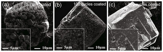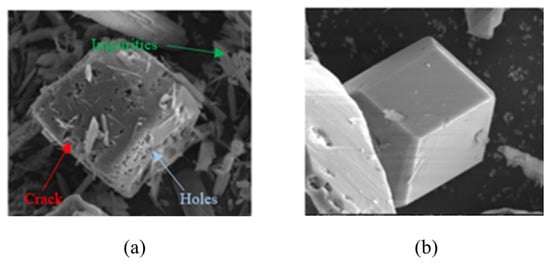 The α-AlH3 particles can also be stabilized using acid solutions. Typically, the acid choices include hydrochloric acid, hydrogen fluoride acid, hydrogen bromide acid, and others, with hydrochloric acid being the most preferable. Petrie et al. [17] used hydrochloric acid solution to clean α-AlH3. Meanwhile, the pickling process can also form Al2O3 or Al(OH)3 layer on the surface of the α-AlH3, which plays a stabilizing role. It took 12.7 days for α-AlH3 treated with hydrochloric acid solution to reach 1% decomposition at 60 °C, while the untreated α-AlH3 only takes 9.3 days. Figure 10 shows the SEM images of α-AlH3 before and after hydrochloric acid treatment. The results demonstrate that acid etching can eliminate cracks and impurities, expected to be beneficial to thermal stability of AlH3 products [24].