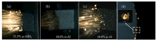 - Bazyn, T.; Eyer, R.; Krier, H.; Glumac, N. Combustion Characteristics of Aluminum Hydride at Elevated Pressure and Temperature. J. Propuls. Power 2004, 20, 427–431. [Google Scholar] [CrossRef]