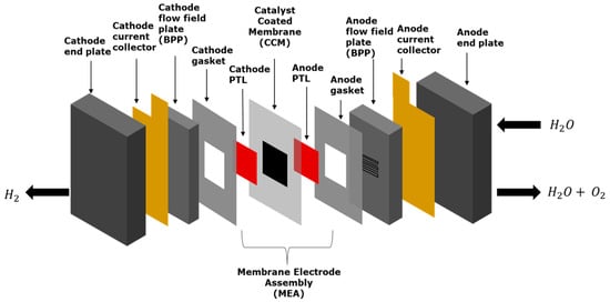 Bipolar Plates (BPPs) are an essential part of the stack that makes up a PEMWE (Figure 3). The main role of bipolar plate components is the separation of single cells within a stack, the distribution of reacting agents inside the electrolyzer, and the conductivity of heat and current through single cells within a stack [1,4]. A BPP is required to have a strong resistance to corrosion, high mechanical strength, high electrical conductivity, and shock endurance. It must also be simple to design and construct so that it can be produced in large quantities. The materials that are normally used for BPP development are graphite and metals (such as titanium, nickel alloys, and stainless steel).