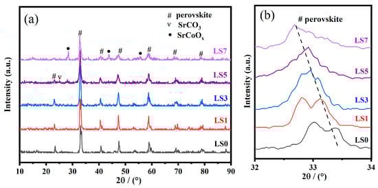 The XRD patterns of LSX perovskite catalysts are illustrated in Figure 1a. Pure perovskite diffraction patterns were obtained with Sr doping amounts lower than 30%, indicating the absence of impurities. However, after Sr doping reached 50%, trace amounts of impurities in the form of SrCO3 and SrCoOx were detected on the LS5 catalyst. In addition, the impurity phase SrCoOx was distinctly observed on the LS7 sample. Therefore, it can be concluded that the LS5 catalyst allows for higher Sr accommodation in the lattice compared to the LS7 catalyst. The cobalt in perovskite serves as the active oxidation site [23], while the hybrid SrCoOx species may occupy the LS7 catalyst surface and cover the active component, thereby influencing the catalyst activity.